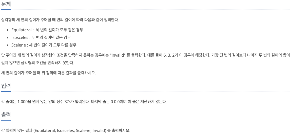 각 입력에 맞는 결과 (Equilateral, Isosceles, Scalene, Invalid) 를 출력하시오.