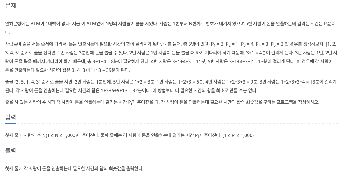문제에 대해 조금 생각을 해보면 최종 시간의 합이 최소값이 되기 위해서는 가장 적은 시간을 할애하는 사람이 가장 먼저 ATM을 사용하는 것이 좋다 왜냐하면 대기 시간이 긴 사람의 경우 그 뒤의 사람들도 그 시간 만큼 대기를 해야하기 때문이다.