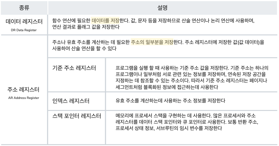 - 데이터 레지스터, 주소 레지스터, 상태 레지스터